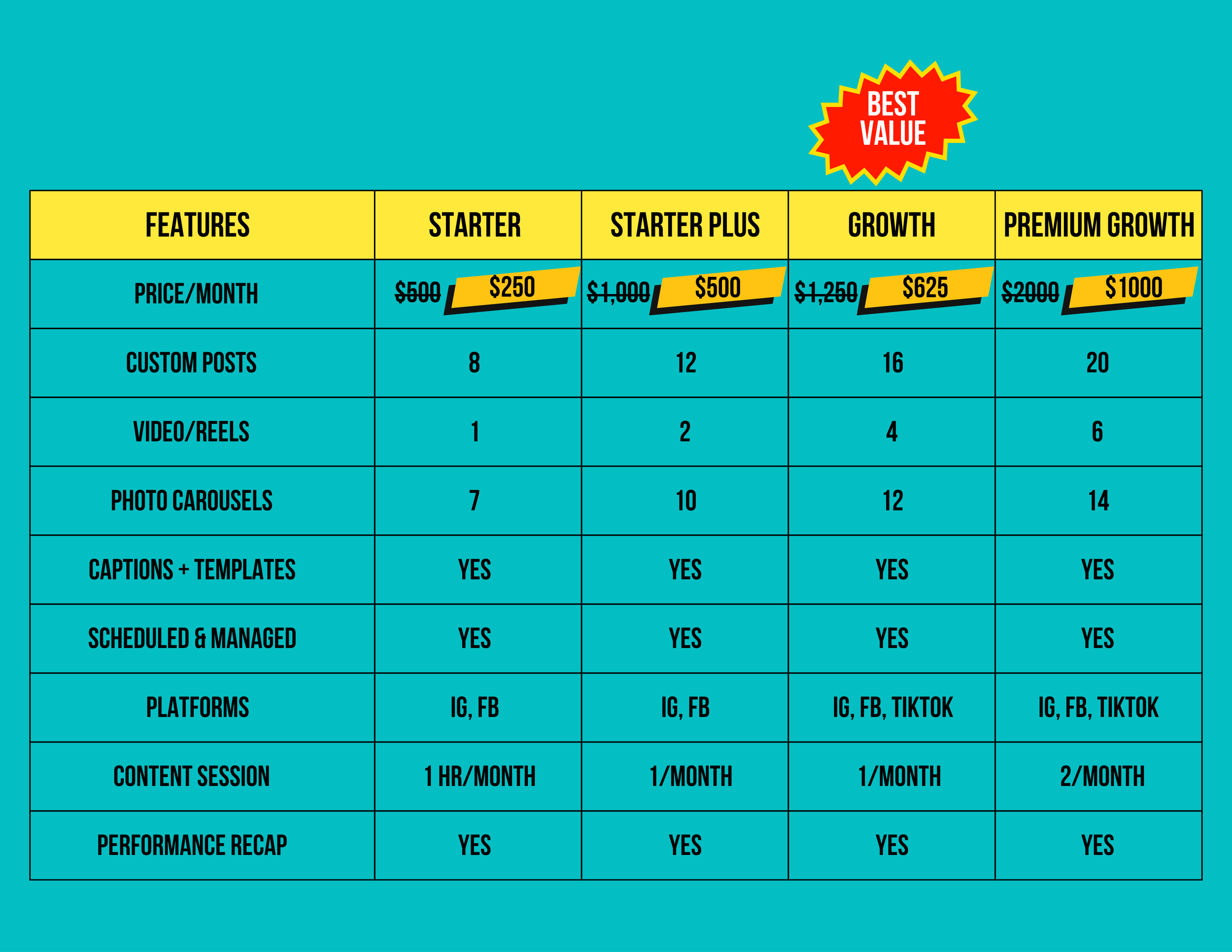 I’m offering my full social media management service at a major discount for the first batch of businesses I work with, in exchange for feedback, a testimonial, and the chance to build results together. You get my A+ attention at 50% off while I perfect my systems and case studies.